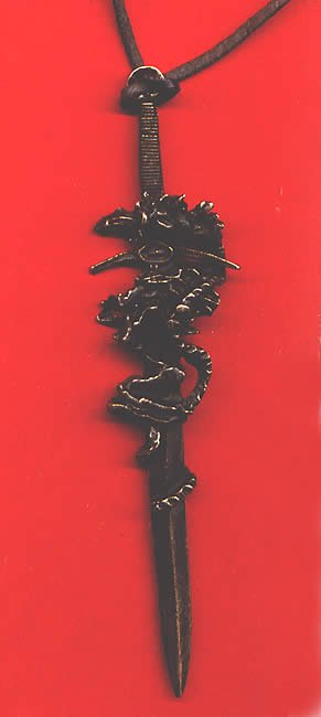 Wisiorek ze smokiem oplatającym miecz Wisiorek zakupiony na targowisku odbywającym się z okazji inscenizacji Bitwy pod Grunwaldem 2003. Być może ktoś w przypływie wyobraźni rozpozna na nim smoka :) cena 3 zł